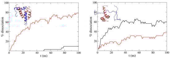 Percentage of dissociated molecules along the simulations starting from the experimental ACTR:NCBD complex (left) and from a non-native bound structure (right) using the normal PACSAB force field (black line) and when hydrogen bonding is removed (red line). The experimental ACTR:NCBD complex is shown in the left panel (ACTR is the blue molecule).