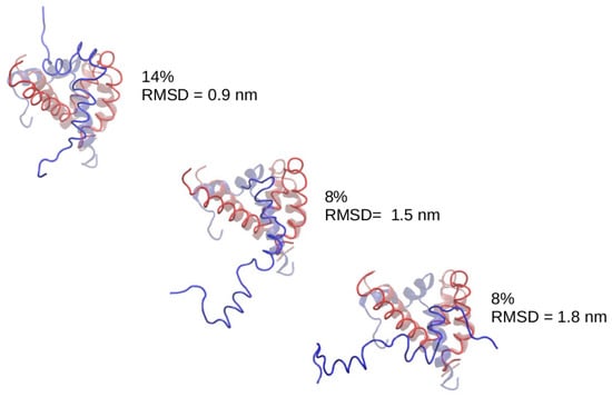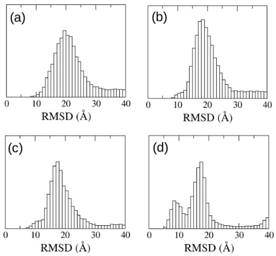 Instead of standard MD, we used the discrete molecular dynamics algorithm (DMD) [], which allows to use discretized interaction potentials. The DMD algorithm is especially efficient in the case of an implicit solvent description of the system [,,], and has been successfully applied to the study of multiple problems, like flexible protein–protein docking [] or simulation of conformational transition pathways in proteins []. The force field discretization used in DMD does not introduce any bias in the simulations, since the sampling of the simulation and the thermodynamics of the system under consideration do not change when the particle–particle interaction potentials are discretized.