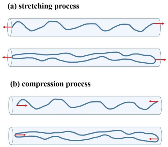 Sketchs of (a) the stretching processes and (b) compression processes for linear and ring polymers, caused by external forces on two ends or two sides, respectively.