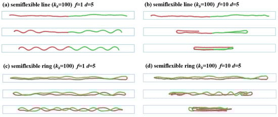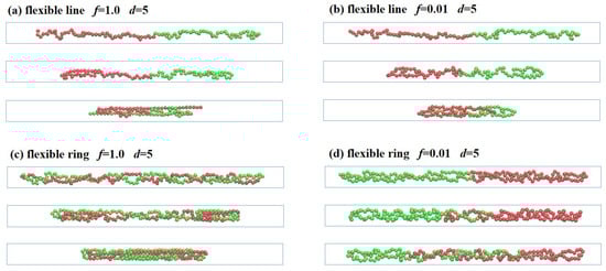 Similarly to the flexible linear polymer, each flexible ring is also compressed from its two sides under a constantly external force (), as shown in Figure 5c. It should be noted that the whole ring is aligned along the tube axis due to the condensed states within the three-folded structure. It is surprising that, differently from the linear polymers, the ring polymers undergo less obvious compression under the same weak force (), as shown in Figure 5d. The two sides of ring polymers cannot be further compressed, due to the strong excluded volume between the two strands of each ring polymer. It means that, in the compression process, the applied force must be large enough to overcome the excluded volume interactions.