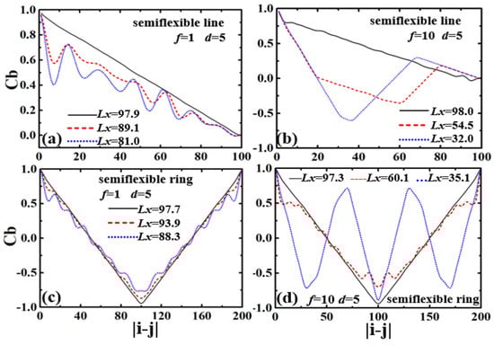 where is the unit vector’s tangent to the chain contour at the position of the ith segment . The bond correlation functions of semiflexible linear and ring polymers in their confined states are shown in Figure 3. In the initially uncompressed state, the bond correlation function of the linear polymer shows exponential decay, whereas of the ring polymer shows a symmetric shape at because of the closed topology. decays to 0 for the semiflexible linear polymer, and declines to the negative minimum at for the semiflexible ring polymer [42]. It is evident that the semiflexible ring has a positive short-range correlation around , and a negative long-range correlation at , due to the special topology of no ends.