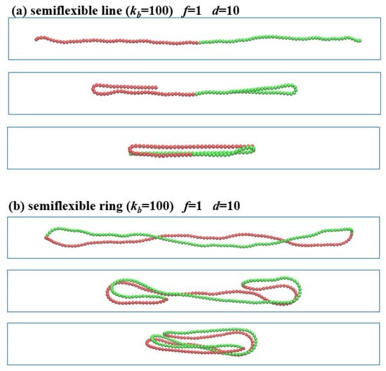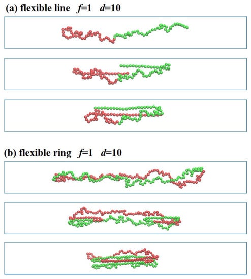 When the flexible linear and ring polymers are confined in the channel with , the polymer chains are folded back under the compression force () without forming helical structures, as shown in Figure 7. The linear polymer is folded back from the two ends. The two ends are stretched out straightly while the rest remains the same during the short relaxation, as shown in Figure 7a. Similar results are found for the flexible ring polymer under (), as shown in Figure 7b. The two sides are folded back under external loads into straightened structures, while the rest maintains its blob structures. Finally, the flexible ring collapses into three-folded structures.