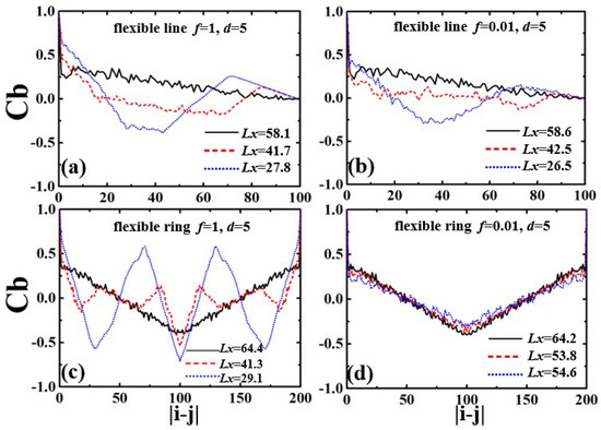 Under the compression force , the two ends of semiflexible linear polymers are folded back, and polymer segments give evidently negative correlations with the folded structures, as shown in Figure 3b. For when the linear polymer shrink to the three-folded structures, the has a valley around and a peak at . Similarly to the linear polymers, the strong confined ring shows two valleys and two peaks for symmetry due to the three-folded structures, as shown in Figure 3d.
