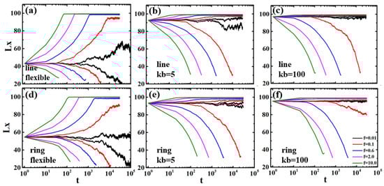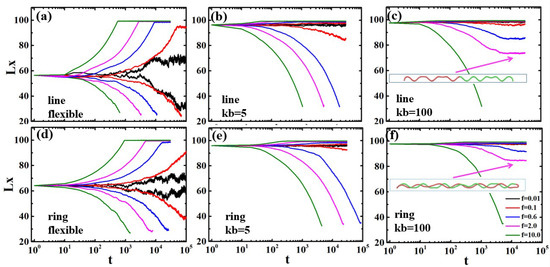 The lengths along the tube as functions of time t of linear and ring polymers with different rigidities under external force f confined in channel diameter . (a) Flexible linear polymer; (b) Semiflexible linear polymer with ; (c) Semiflexible linear polymer with ; (d) Flexible ring polymer; (e) Semiflexible ring polymer with ; (f) Semiflexible ring polymer with .