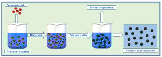 This is an effective method that has been extensively used in the last few decades to prepare polymer nanocomposites. Typically, nanomaterials and monomers or multiple monomers are mixed in a suitable solvent, followed by polymerization with an appropriate reagent to yield polymer nanocomposites (Figure 2). This method enables the fabrication of well-defined multidimensional structures with distinct properties from the initial precursors. Homogenous dispersion in a polymer matrix can be achieved by this technique, which also assists in controlling the size, shape, and morphology of the nanomaterials [2].