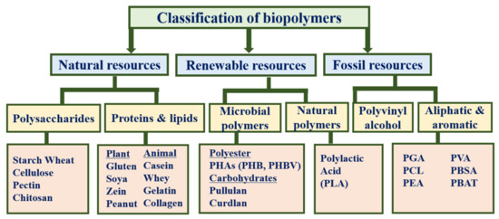 Biopolymers can be classified into the following groups based on the origin of the raw materials (renewable or non-renewable) and their manufacturing process (Figure 5): natural resources, microbial or renewable resources, and synthetic or fossil resources. Natural biopolymers are subdivided into polysaccharides (starch, wheat, cellulose, pectin, and chitosan) and proteins and lipids (gluten, soya, zein, peanut, casein, whey, gelatin, and collagen). Similarly, renewable polymers are categorized into microbial polymers, such as polyesters (PHB and PHBV), carbohydrates (pullulan and curdlan), and natural polymers, such as PLA. Synthetic polymers are further categorized into PVA and aliphatic and aromatic polymers (polyglycolic acid (PGA), PCL, polyester amides (PEAs), PVA, poly (L-lactide) (PLA), polybutylene adipate-co-terephthalate (PBAT), and polybutylene succinate-co-butylene adipate (PBSA)) [76,77].