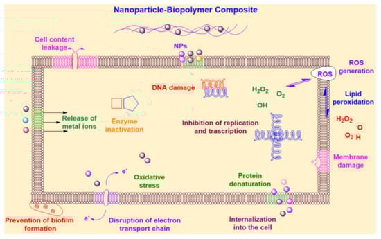 Nanocomposites have a remarkably positive zeta potential, which promotes their interaction with cell membranes by electrostatic binding to cell walls and releasing metal ions. The negatively charged bacterial membranes and positively charged nanocomposites induce electrostatic attraction and modify the permeability of the cell membrane. Therefore, disrupting the integrity of bacterial membranes is an efficient mechanism of action [172]. ROS production is an alternative mechanism that affects the physiological functions of cells and eventually damages DNA. Different types of ROS, such as superoxide anionic radicals, hydroxyl radicals, hydrogen peroxide, and the hydroxyl radical produced in mitochondria, exhibit varying levels of activity. Protein dysfunction is another mechanism of action by which nanocomposites bind to cytosolic proteins, such as DNA and enzymes, which leads to oxidative stress, damage of communication channels, peroxidation of cellular constituents, DNA strand breakage, lipid peroxidation, and modification of nucleic acids [15]. However, in the case of enzymes, carboxylation results in the loss of catalytic activity and accelerates protein degradation [173].