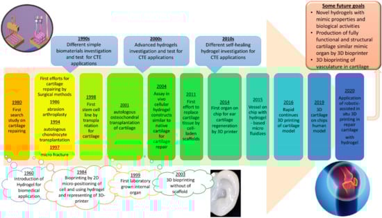 The timeline of the major developments in CTE is presented in Figure 1. It started with the simple definition of hydrogel in 1960 and has reached the novel bioprinting for CTE using advanced hydrogels. Its focus on CTE for cartilage repairing also briefly addresses the development of hydrogels for CTE applications. Several review papers studied different natural and synthetic biopolymers and their properties, their recent advances including nanocomposites and interpenetrating networks, etc., fabrication of hydrogel scaffolds, and fillers utilized as hydrogel components for cartilage repairing [13,14,15,16]. Additionally, some papers considered self-healing hydrogels in tissue engineering. However, these articles did not provide an overall and comparative classification of the self-healing hydrogel for CTE application, which is essential from the material selection point of view. While several research groups have comprehensively reviewed self-healing materials, these publications have rarely focused on applying such systems in CTE. In the current manuscript, we concisely explained self-healing hydrogels in CTE. This review summarized the latest efforts for the preparation of hydrogels for cartilage-repairing applications, with a particular focus on advanced self-healing hydrogel. Therefore, the outstanding goal of the current review was to reinforce the importance of modification and improvement of the high-performance hydrogels in CTE.