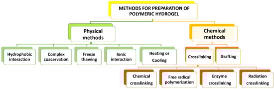 Hydrogels could be produced by physical and/or chemical processes. A schematic diagram of various methods of hydrogel production is represented in Figure 4. Physically prepared hydrogels are created via relatively weak intermolecular forces, but chemical methods of hydrogels preparation are typically created by covalent crosslinking [13].