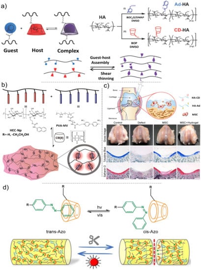Due to the reversibility of these interactions, formed polymer networks illustrate self-healing properties. The most popular self-healing polymers that involve in guest-host interactions are based on cyclodextrins, cucurbits. Under high tensions or forces, these non-covalent interactions are reversibly broken for damping network energy. The reversible bonds also develop shear-thinning properties that facilitate their application in CTE [103,104]. Jeong et al. modified hyaluronic acid (HA)-based hydrogels by β-cyclodextrin. Resulted hydrogels demonstrated remarkable shear-thinning, cell viability, adhesive strength, and desirable mechanical properties for CTE applications [105]. Until now, several hydrogel substances have been employed for stem cell therapy. Salati et al. reviewed the sources and superior properties of the agarose-based bio-materials with/without various types of signaling molecules and their functions in the keeping of cartilage homeostasis [18].