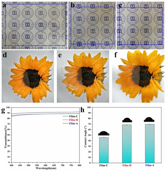 The hydrophilicity of the PE film and cellulose-based films were characterized by OCA 50, which was purchase from Dataphysics of Stuttgart, Germany. The water contact angles of Film-H, Film-A, and Film-C were recorded, and five spots were recorded for each sample and the average value was reported.