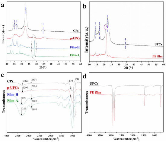 XRD of CPs, p-UPCs, W-film, and E-film (a) and XRD of UPCs and PE film (b). FTIR of CPs, p-UPCs, W-film, and E-film (c), and FTIR of UPCs and PE film (d).