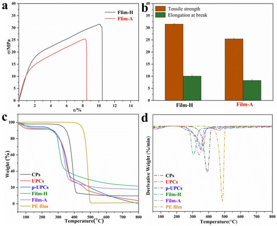 Stretch strain-stress (a) and tensile strength and elongation at break (b) of Film-H and Film-A; TG curves (c) and DTG curves (d) of CPs, UPCs, p-UPCs, Film-H, Film-A, and PE film.