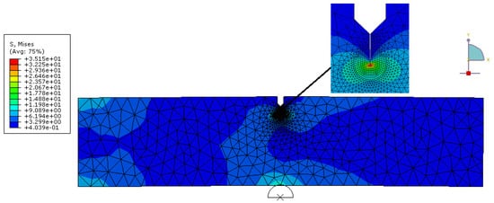Furthermore, fracture toughness measurements from 3P bending test are simulated. The elastic stress analysis is performed using ABAQUS/Implicit. Finite element model representing the dimensions used in experiments is performed to calculate the maximum energy release rate of each specimen. Symmetric boundary conditions are applied along the corresponding edges of symmetry. Figure 5 shows the typical configuration and mesh of one of the models for plane strain condition. In order to obtain high stress field around the crack, relatively fine mesh sizes are adopted in this region as seen in Figure 6. Material properties obtained from the test result are used in the calculations. In linear elastic fracture mechanics, the stress intensity factor is used to characterize the fracture toughness of a brittle material. The fracture toughness is assumed as constant for a given specimen thickness. To check the validity of this assumption regarding the specimen configuration, the stress intensity factors are calculated for the maximum deflections observed from bending tests. To implement the test result, the displacements are given at the center of the specimen and elasticity modulus is used as in the experimental results. After that, maximum force is obtained and compared with the experimental value. The proportion of these two values is used to modify the elasticity modulus. After modifying the elasticity modulus, the model is run again, and elasticity modulus modification is done until a coherent maximum force regarding experimental results is obtained. After converging to the maximum force, energy releasing rate of the composites is determined along the specimen thickness. Mechanical properties are implemented for finite element analysis for specimens 2, 3 and 4 and the critical stress intensity factors are calculated very close to the values obtained by experimental values and shown in Table 7.