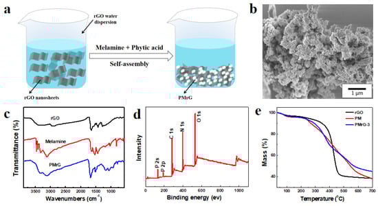 (a) Schematic representation for the preparation of PMrG; (b) SEM images of PMrG; (c) FTIR spectra of rGO, Melamine and PMrG; (d) XPS spectra for PMrG; and (e) TGA curves of rGO, PM, and PMrG-3.