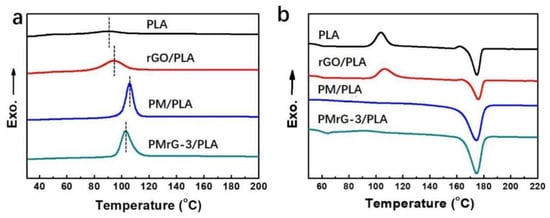 DSC curves of PLA, rGO/PLA composite, PM/PLA composite, and PMrG-3/PLA composite: (a) cooling process; (b) heating process (the mass fractions of the additives in the composites are all 10%).
