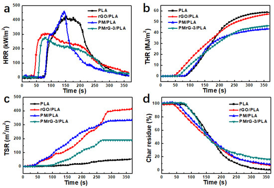 The HRR and THR curves of the neat PLA and the PLA-based composites are shown in Figure 6a,b, respectively. It can be seen that the neat PLA burned at 74 s, showing a single pHRR of 426.6 kW/m2 at 170 s, and the THR reached 58.8 MJ/m2. The pHRR for the composite containing 10 wt% rGO reduced by 27.5% to 309.1 kW/m2, while the THR displayed no significant change compared with the neat PLA. In addition, the rGO/PLA composite ignited earlier than the neat PLA. When 10 wt% PM was added into the PLA, the obtained composite exhibited a sharp HRR peak with pHRR of 456.6 kW/m2. However, the THR significantly reduced, by 26.55%, to 43.2 MJ/m2 compared with that of the neat PLA. The incorporation of 10 wt% PMrG resulted in an earlier TTI and a decreased pHRR value, which is similar to the effect created by the addition of rGO. The pHRR values of the PMrG/PLA composites were even lower than those of rGO/PLA (Table 1 and Table S5). Furthermore, the PMrG/PLA composite also exhibited a low THR value (Table 1 and Table S5). Therefore, as the self-assembling product of rGO, melamine, and PA, PMrG endows PLA composites with a slower heat release rate and a reduced THR simultaneously. It can be seen from Table S5 and Figure S4 that the PMrG/PLA composite with PMrG-3 as the flame retardant exhibited the latest TTI (59 s), the lowest pHRR (276.1 kW/m2), and lower THR (46.5 MJ/m2) values, indicating that PMrG exerts the best flame retardant effect on PLA when the ratio of rGO, melamine, and PA is 1:1:5.