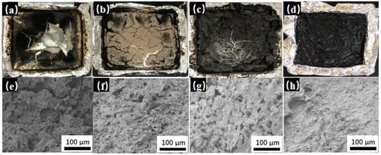 Digital images of char residues for (a) PLA, (b) rGO/PLA, (c) PM/PLA, and (d) PMrG-3/PLA after cone calorimeter test; SEM images of char residues for (e) PLA, (f) rGO/PLA, (g) PM/PLA, and (h) PMrG-3/PLA after cone calorimeter test.