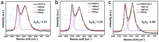 To further clarify the flame retardant mechanism of PMrG on PLA, Raman spectroscopies of the char residues after CCT were conducted. The obtained spectra are shown in Figure 8. The graphitization degree of the char residue is always reflected by the ratio of ID and IG. A lower ID/IG value means a higher graphitization degree, indicating a denser char layer structure []. For the neat PLA, the residual carbon was hardly formed after its combustion; thus, no continuous carbon layer was formed. The ID/IG values of the rGO/PLA and PM/PLA composites were 1.22 and 1.2, respectively (see Figure 8a,b). By contrast, the PMrG-3/PLA composite exhibited an ID/IG value of 1.08 (see Figure 8c), indicating that PMrG-3 clearly enhances the graphitization degree of char layers, which is strongly consistent with the SEM images in Figure 7.