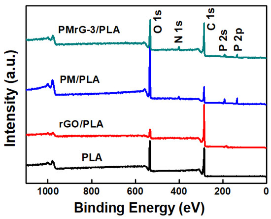 Furthermore, the compositions of char residues were analyzed by XPS (see Figure 9). It can be seen that the XPS spectra of all the samples displayed sharp peaks at 285.8 eV and 533.5 eV, which corresponded to the C and O elements, respectively. For the PMrG-3/PLA composite, a P2s peak at 135.9 eV, a P2p peak at 190.5 eV, and an N1s peak at 399.4 eV can be observed in its XPS spectrum, indicating the presence of phosphorus and nitrogen in its char residue. The same peaks also presented in the XPS spectrum of the char residues of the PM/PLA; thus, the phosphorus and nitrogen were likely provided by the PA and melamine components. The presence of phosphorus enhanced the density of the char layer, thereby improving the heat resistance of the composites significantly.