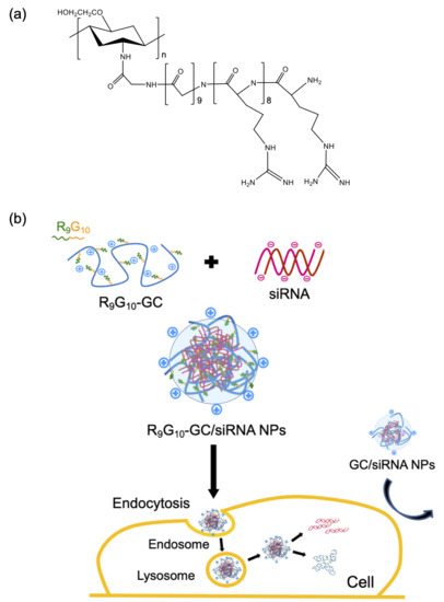(a) Chemical structure of nonaarginine-modified glycol chitosan (R9G10-GC) and (b) schematic description for preparation of R9G10-GC/siRNA nanoparticles and their cellular uptake.