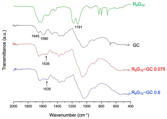 Fourier transform infrared spectroscopy (FT-IR) spectra of R9G10-GCs with different substitution degrees. The new amide bonds in R9G10-GCs after conjugation reaction were observed at 1535 cm−1 and indicated by arrows.