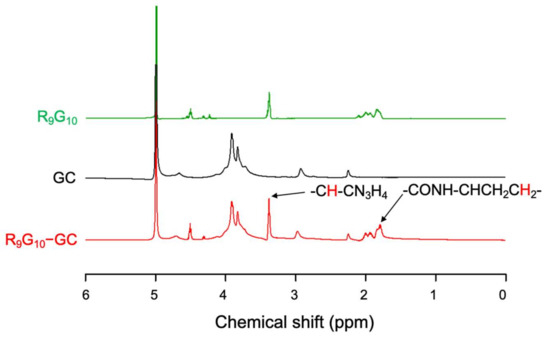 The conjugation of R9G10 and GC was identified by FT-IR and 1H NMR spectroscopy. The bands of C = O stretching at 1645 cm−1 (amide I) and NH bending at 1590 cm−1 (primary amine) were observed for the GC by FT-IR spectroscopy [42]. A new peak corresponding to the amide bond was observed at 1535 cm−1 for R9G10-GCs (Figure 2), indicating the successful covalent linkage between R9G10 and GC. In addition, the band of C(O)–O stretching of R9G10 at 1191 cm−1 disappeared after conjugation with GC [36,43]. The new peaks were also observed by 1H NMR spectroscopy at 1.8 ppm (–CONH–CHCH2CH2–) and at 3.3 ppm (–CH–CN3H4) for R9G10-GC (Figure 3) [36,44]. The degree of substitution (DS), which indicates the molar ratio of R9G10 per 100 glucosamine residues in GC, was confirmed through elemental analysis (Table 1). The conjugation efficiency, calculated from the theoretical and actual DS values, was >90% for the R9G10-GCs used in this study.
