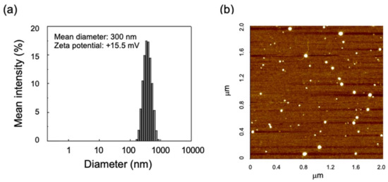(a) Size distribution of R9G10-GC 0.6/siRNA nanoparticles measured by the dynamic light scattering method at 25 °C and (b) atomic force microscopy (AFM) image of the nanoparticles (R9G10-GC 0.6/siRNA = 50, weight ratio).