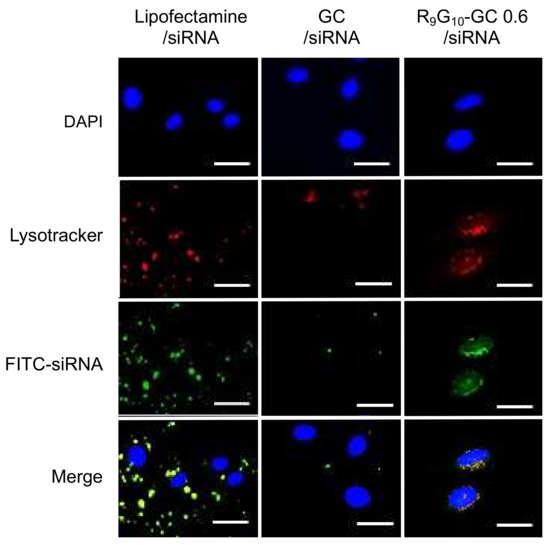 The uptake of nanoparticles prepared with nonaarginine-modified GC and FITC-labeled siRNA in the HeLa cells was investigated. Internalization of FITC-siRNA (green) in the lysosome (red) was observed for Lipofectamine/siRNA and R9G10-GC/siRNA nanoparticles (Figure 7). The cellular uptake of R9G10-GC/siRNA nanoparticles was also higher than that of GC/siRNA nanoparticles. This finding may be because the nonaarginine peptide plays a critical role as a CPP when delivering nanoparticles into cells. Naked siRNA alone is not substantially taken up by cells due to the negatively charged cell membrane. It has been reported that the trans-membrane function of the nonaarginine peptide significantly can enhance the cellular uptake and resultant transfection efficiency [39,45].