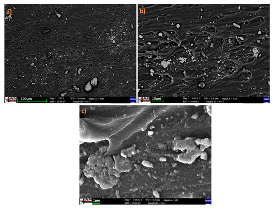 Material morphology and the distribution of iron particles in the PDMS 3 composite were investigated using scanning electron microscopy (SEM) (Figure 5). It is noteworthy that, under an applied magnetic field, the iron particles tended to decrease the energy of the magneto-static to reach a stable order. Moreover, iron particles arranged rapidly in a direction parallel to that of the magnetic field. The particles had magnetized in the same tendency, and the magnetic pole interactions between the sphere chains caused the particles to repel each other until an equilibrium interval was reached. Subsequently, the long-chain structure of the particles agglomerated to create columns. These agglomerates were then magnetized under the applied magnetic field and united into linear chains that aligned along the direction of the magnetic field. The chain length was limited by the elastic resistance of the host polymer to the displacement of the agglomerates. The presence of such columns was also detected by Calabro et al. in a previous study [27]. PDMS permits the magnetically responsive particles to respond to the field by deforming the microsphere shape, with the shell extending in the direction of the magnetic field [28,29]. The increase in the temperature using magnetic-induction-based heating leads to appreciable diversity in the structure of materials, and the distribution of the Fe particles in the PDMS matrix affects the properties of the fabricated material. In addition, the agglomeration and orientation of the Fe filler affect the swelling and the mechanical properties of the composites.