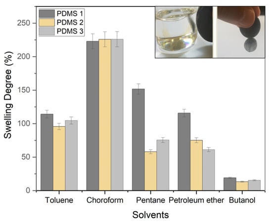 Volatile organic compounds exert a negative impact on the environment and human health. These compounds evaporate at room temperature and pressure, causing the vapors to be present in both indoor and outdoor environments [3,4,5]. The hazards caused by the increasing amounts of petrochemical solvents, such as toluene, chloroform, pentane, petroleum ether, and n-butanol, should be particularly focused on, as these solvents are highly toxic and difficult to remove from the environment [6,7]. Compound adsorbents, which include shrink-bonded polymers and rubber materials, adsorb fluids on their solid structure and swelling. The PDMS matrix also allows the permeation of organic solvents, leading to an increase in the polymer volume and polymer swelling, which depend on the volume of solvent permeated [31]. The degree of swelling of the material is determined by the solubility of the solvent. The swelling behavior of PDMS in different organic solvents is presented in Figure 7. PDMS swelled to the greatest extent in the presence of chloroform, while a large extent of PDMS swelling was observed in toluene, pentane, and petroleum ether as well. The swelling was the least in n-butanol, which is a polar solvent. In other polar solvents as well, the swelling was less evident. Bhanushali et al. reported that the solvents with δ ≈ 15.5 (MPa)0.5 cause the greatest degree of swelling in the PDMS membranes, which have a similar δ value, at a maximum solubility of ~2 g solvent per g of the polymer [32]. A higher degree of swelling could, however, be obtained when the solubility of the solvent was close to that of PDMS. This was attributed to hydrogen-bonding, polarity, and dispersive effects, which depend on the molecular structures and chemical groups of both solvents and polymers. Therefore, the solvents and polymers that have comparable solubility of the parameter are expected to interact strongly and allow the solvent to be soluble in the polymer, thereby allowing considerable polymer swelling to occur. The PDMS swelling observed in the non-polar solvents is due to the empty net structure in the polymer. The degree of swelling might also be affected by the degree of crosslinking, which is affected by the Fe content. The study of the swelling behavior of PDMS in different organic solvents is critical in the case of layout PDMS meant for the extraction process, in which the PDMS composite is used for organic solvent removal based on its magnetic property (Figure 7). The composites that hold solid metal fillers exhibit a range of outstanding properties, such as lower density, low cost, and simple fabrication [33]. These properties, together with the magnetic character, render the composites suitable for application in oil collection [34,35,36]. Magnetic character is also crucial for reusing and separating the composites from the medium simply by using a magnetic field. The materials that could be applied as adsorbents for the removal of organic solvents from the environment using a simple technique are highly desirable.