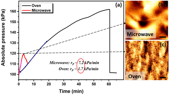 The effect of osmotic pressure ramp on phase separation. (a) In situ measurement of vapour pressure during annealing of PS-b-PLA film in conventional oven with lower ramp of , and in the microwave with the rapid pressure ramp of . Topographic AFM images of the SVA film in the microwave (b), and oven (c), at the point when the vapour pressure reached 120 kPa. Scale bars are 300 nm.