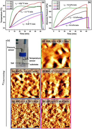 (a) Temperature and (b) absolute vapour pressure profiles for the films annealed in oven at different temperature ramps for 60 min. Higher temperature ramp leads to higher degree of order. AFM images (scale bars 300 nm) show high coherence length for (d) high heating ramp (, sample 60A); moderate phase separation for (e,f) medium heating ramp (, samples 60C and 60D); poor phase separation for (g,h) low heating ramp (, samples 60E and 60F). Image (c) shows the annealing jar with temperature and pressure sensors.