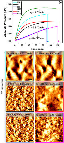The significance of pressure ramp over the length of the annealing time. Absolute vapour pressure (a) and relevant AFM images (b–g) for the films annealed in oven at different ramps for 90 min (samples 90A (b), 90C (d), 90E (f)) and 120 min (samples 120A (c), 120C (e), 120E (g)). AFM scale bars are 300 nm. At low heating ramp, increasing the annealing time does not appear to improve the order.