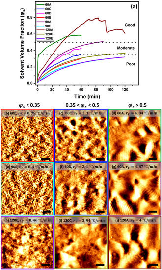 The effect of heating ramp on solvent uptake. (a) Evolution of solvent volume fraction () in the swollen films during slow and fast heating regimes, and various annealing intervals. Corresponding AFM images show how the solvent volume fraction imposes different degrees of the lateral order in PS-b-PLA film (poor/moderate/good): (b,e,h) showing poor phase separation ; (c,f,i) showing moderate phase separation ; (d,g,j) showing good translational order . The AFM scale bars are 300 nm.