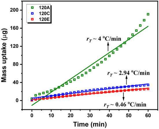 To study the kinetics of diffusion, the solvent mass uptake (M) was estimated from the solvent density (ρs) and the increase in the film during the annealing. First, the swollen film thickness was extracted from (, with being the initial dry film thickness, 217 nm). Then, could be determined (; L and W being the width and length of the substrate). The evolution of the mass uptake during the swelling is shown in Figure 5, illustrating the solvent diffusion kinetics for the PS-b-PLA film. Figure 5 clearly shows that the mass uptake increases as the solvent diffuses through the film and is linearly proportional to time, which is characteristic of Case II diffusion. At the beginning of the swelling process, the mass uptake is higher and deviates from linearity. The deviation is more pronounced at a higher heating ramp, which is expected due to the fast build-up of the vapour molecules readily diffusing through the surface of the film when the swelling starts. However, the swelling phenomenon is complex. More research is needed to explain the deviation from linearity in the initial stages by exposing the films at various diffusion rates. The penetrating solvent plasticises the polymer by reducing the glass transition temperature (Tg), thereby allowing the solvent molecules to move easier into the polymer film in its glassy state. The solvent penetration rate is linear with respect to time for all the ramp regimes.