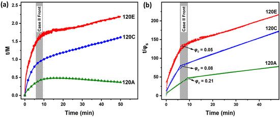 Second order kinetics during swelling. (a) Time over mass uptake (t/M) and (b) time over solvent volume fraction with respect to time. Films were annealed at different heating ramps, 120A (), 120C ( ) and 120E ( ). is directly proportional to time, which is characteristic of second order kinetics. vs. time showing two distinct stages in swelling order kinetics. Solid lines represent linear fits for the relevant curves.
