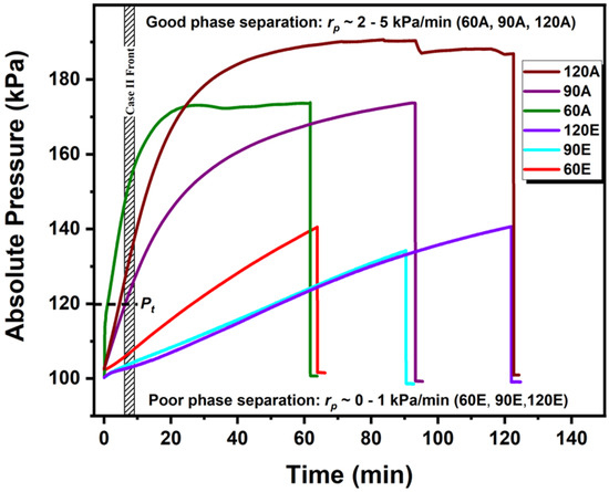 The summary of the absolute vapour pressure profiles exhibiting good and poor microphase separation is demonstrated in Figure 7. The films annealed with a minimum pressure ramp of 2 kPa ( promoted a good phase separation with a high translational order. The higher the ramp, the greater the long-range order. A pressure ramp of less than 1 kPa leads to poor phase separation. The temperature and the pressure ramp seem to be a more significant parameter for improving the order than the absolute value of the vapour pressure or the temperature only. The absolute pressure reaching the threshold pressure value of (120 kPa) in its early stage of swelling leads to good phase separation with a higher translational order. Reaching the threshold pressure later in the propagation stage, even at a longer annealing time, results in a poor phase separation. These results suggest that the minimum pressure ramp should be high ( so to reach the threshold pressure in the early stage of the swelling. This is in agreement with earlier studies [64] that reported that the swelling rate in the second stage did not impact the final morphology of the film, which further emphasises the importance of the pressure ramp in the early stage. The experimental insights outlined here on the critical aspects of temperature and pressure ramps during SVA will aid in the further optimisation of the processing strategies in BCP systems and other polymeric thin film materials [63].