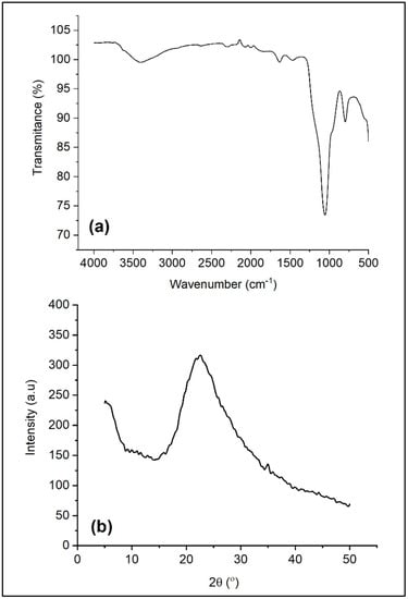 FTIR spectra (a) and XRD pattern (b) of nano-SiO2 from sugarcane bagasse.