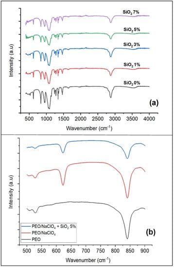 FTIR spectra of solid polymer electrolyte (a) PEO/NaClO4 + nano-SiO2 0%, 1%, 3%, 5% and 7% (b) PEO, PEO/NaClO4 and PEO/NaClO4 5% in 500–900 cm−1 spectral range.