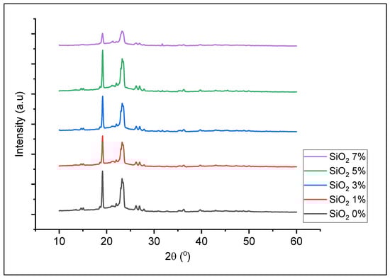 XRD diffractogram of PEO/NaClO4 solid polymer electrolyte with 0%, 1%, 3%, 5% and 7% nano-SiO2.