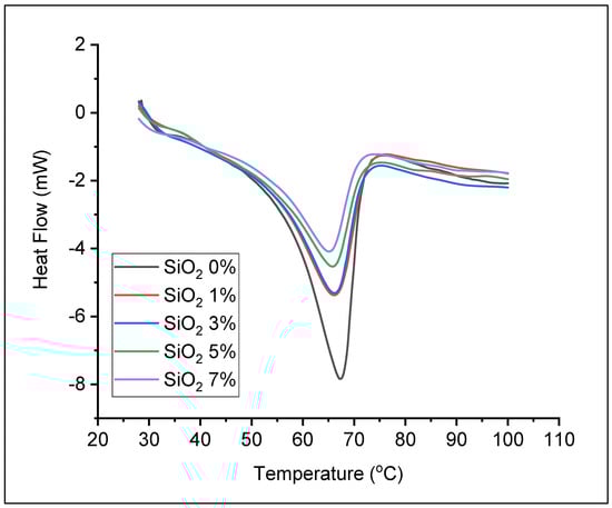 Thermal analysis curve of solid polymer electrolytes using DSC can be seen in Figure 4. The endothermic peak at about 67 °C indicates the melting temperature (Tm) of the sample. The addition of nano-SiO2 to the solid electrolyte polymer decreased the endothermic peak and the melting point. The melting points were decreased after the addition of 1% and 3% nano-SiO2 to 66 °C and decreased to 65 °C with addition of 5% and 7% nano-SiO2. The decrease in melting point is due to the decrease of solid electrolyte polymer film crystallinity with increase of the nano-SiO2 content, according to the results obtained by XRD characterization, Figure 3. It was estimated that the nano-SiO2 was dispersed homogeneously to fills the space between the PEO chains, thereby preventing or inhibiting PEO crystallization due to the large surface area [25].