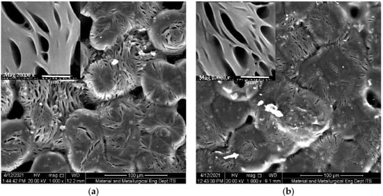 SEM micrographs of the solid polymer electrolyte film with/without the filler were shown in Figure 5. The compatibility between the polymer matrix and the inorganic fillers (silica nanoparticles) has great influence on the properties (mechanical, thermal, ionic conductivity and interface stability) of the PEO-based composite electrolytes [27]. Figure 5a shows the morphology for solid polymer electrolyte PEO/NaClO4 before the addition of silica nanoparticle. PEO film with the addition of silica nanoparticle shows a smoother polymer film surface, Figure 5b. The porosity of the polymer film increases after the nano-SiO2 addition. A smoother SPE surface means the ions can move freely in the electrolyte, thus the conductivity enhancement was produced [14].