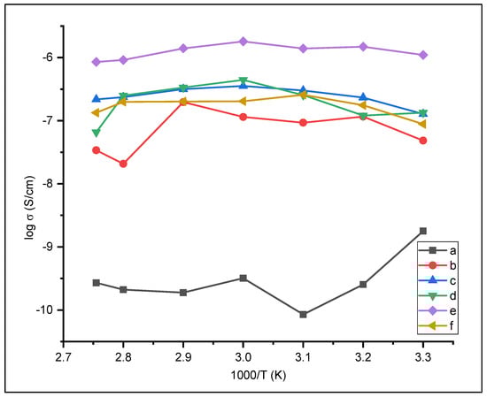 Temperature-dependent of ionic conductivity (a) PEO (b) PEO/NaClO4 (c) PEO/NaClO4 + nano SiO2 1% (d) 3% (e) 5% (f) 7%.