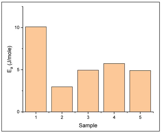 Activation energy values of (1) PEO/NaClO4 (2) PEO/NaClO4 + nano SiO2 1% (3) 3% (4) 5% (5) 7%.