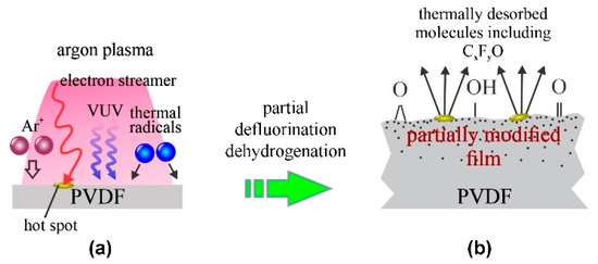 Low-pressure plasmas have been used for tailoring surface properties of polymers for decades. One of the first reports on the modification of PVDF by plasma was provided by Duca et al. [6]. They used a low-pressure capacitively coupled RF discharge for sustaining plasma in argon. The plasma reactor was ultra-high vacuum compatible, and it was pumped down to about 4 × 10−5 Pa to assure high purity of the atmosphere during plasma treatment. The authors reported the static water contact angle (WCA) for untreated PVDF just above 70°. The WCA dropped to approximately 45° even after a second of plasma treatment and stabilized at approximately 35° after 15 s of plasma treatment. X-ray photoelectron spectroscopy (XPS) showed a gradual decrease in the fluorine concentration. The initial F/C ratio of 0.85 was close enough to the theoretical value (which is 1), and it decreased down to approximately 0.1 for prolonged treatment time at moderate or large powers. The F/C ratio remained approximately 0.5 even after a minute of treatment at the lowest power (4 W) used in their experiments. The oxygen concentration increased after the plasma treatment, which the authors explained by post-treatment oxidation upon exposure to air. No correlation between fluorine depletion and oxygen enrichment was found by Duca et al. [6]. In fact, the highest concentration of oxygen on the Ar-plasma treated PVDF for a minute was found for low discharge powers, i.e., O/C ≈ 0.15. This observation may be a result of the surface heating at elevated powers. The evolution of the surface morphology was monitored by atomic force microscopy (AFM). The roughness increased from 5 to 7 nm after approximately 10 s of plasma treatment at the power of 100 W and remained fairly constant thereafter. More interesting was the observation of the periodical structures on the polymer surface. Duca et al. [6] have not provided any explanation for the appearance of the periodical structures, but a couple of decades later, Bruce et al. [7] explained such structures by the formation of a stiff plasma-modified film on the soft unmodified bulk. Furthermore, Vegh et al. found out that the Ar+ ions cause dehydrogenation and crosslinking of the modified layer because of the preferential sputtering of H atoms relative to C atoms [8]. Recently, Lojen et al. reported the influence of the vacuum ultraviolet (VUV) radiation on the surface kinetics of fluorinated polymers upon plasma treatment [9]. The recent achievements in the field of plasma–polymer interaction [8,9] enable a detailed explanation of results reported by Duca et al. in their pioneer paper [6]. Upon exposure of PVDF to plasma sustained in high-purity argon by capacitively coupled RF discharge, the PVDF material is subjected to both energetic Ar+ ions and VUV radiation. Both ions and radiation cause depletion of the surface film from fluorine and hydrogen, thus causing a thin surface film of periodical morphology. The surface film is rich in carbon after the plasma treatment. The carbon-rich surface film is then partially oxidized upon exposure to ambient air prior to XPS characterization. The effect is illustrated in Figure 1.