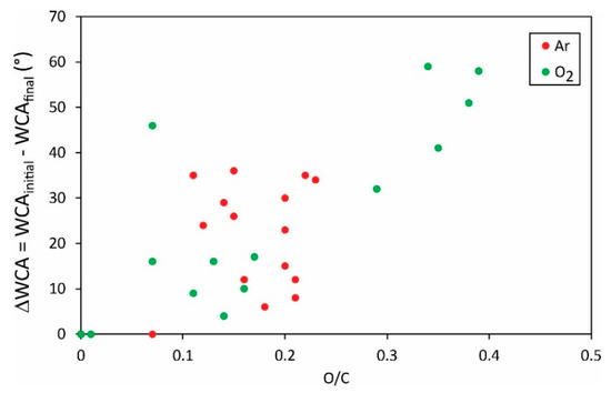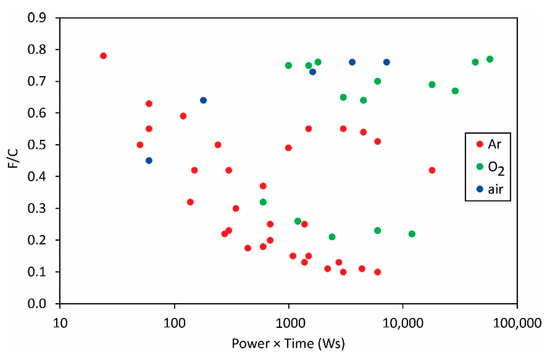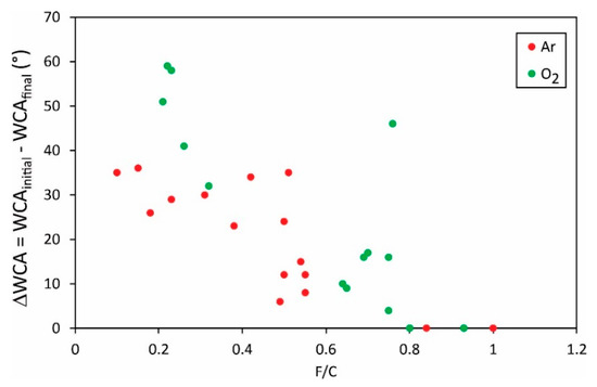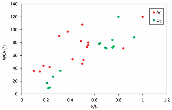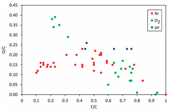 Different authors reported various initial water contact angles, i.e., the static WCA for a sample before any plasma treatment. The WCAs after the plasma treatment as shown in Figure 5 and Figure 6 may, therefore, not be the most representative results. An important result may be the change in the water contact angle, i.e., the difference between the initial and the final water contact angle. The difference of the O/C versus the F/C ratio, respectively, is plotted in Figure 7 and Figure 8.