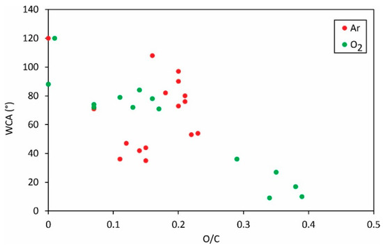 Again, the results are scattered, but the trend is obvious: a larger concentration of oxygen in the surface film results in a lower static water contact angle. The large oxygen concentration is therefore favorable for high surface wettability, the same as for most other polymers. The significant deviation of the measured points for argon plasma from the general trend is, again, explained by different mechanisms as illustrated in Figure 1, Figure 2 and Figure 3.