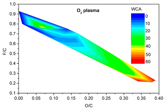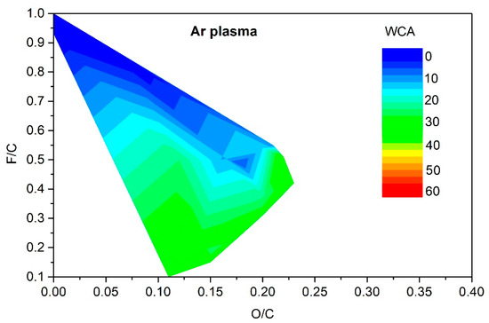 Figure 5, Figure 6, Figure 7 and Figure 8 reveal the variation of the static water contact angle versus the surface composition. The results are scattered because of various experimental conditions leading to a vague relationship between the oxygen and fluorine concentrations, as revealed in Figure 4. The range of achievable hydrophilization when using argon plasma is illustrated in Figure 9.