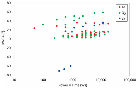 The difference between the initial static water contact angle and the WCA after the treatment versus the product of the reported discharge power and treatment time.